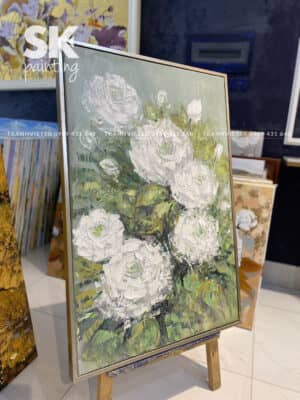 Khác với hoa hồng đỏ mang sắc thái đam mê mãnh liệt, hoa hồng trắng lại tượng trưng cho sự thuần khiết, chân thành và thanh cao. Tác phẩm “Bạch Hồng Khoe Sắc” khai thác hình ảnh hoa hồng trắng đang nở rộ trên nền lá xanh mát dịu, như một bản giao hưởng tĩnh lặng và tinh khôi trong dòng tranh phong cảnh sơn dầu hiện đại.