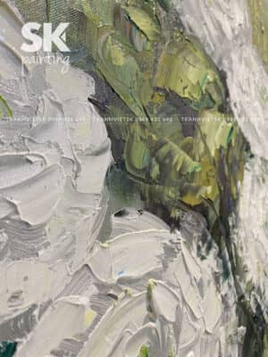 Không gian nền của tranh được xử lý tinh tế bằng những gam màu trung tính như ghi xám, xanh olive – vừa tôn lên vẻ trắng tinh khôi của hoa, vừa mang lại chiều sâu không gian. Kỹ thuật layering (xếp lớp màu) được áp dụng hiệu quả để tạo nền phông mờ ảo phía sau, gợi nên cảm giác mộng mơ đặc trưng của tranh sơn dầu phong cảnh.
