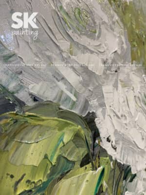Họa sĩ đã dùng nhiều lớp trắng khác nhau: trắng tinh, trắng kem, trắng xám nhạt, kết hợp với những nét ánh sáng vàng nhẹ… để tạo nên những lớp cánh hoa có độ phồng, độ cong, mang cảm giác như đang nở dần trước mắt người xem. Màu xanh lá cũng được phối chuyển tinh tế từ đậm sang nhạt, khiến phần nền vừa nổi bật lại vừa không át đi chủ thể chính.