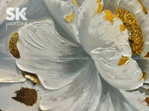 Tác phẩm khắc họa hình ảnh hai đóa hoa nở rộ với gam màu trắng tinh khôi xen lẫn những nhụy hoa ánh vàng rực rỡ. Sự phối hợp hài hòa giữa sắc trắng thanh thoát và sắc vàng lấp lánh mang đến cảm giác vừa nhẹ nhàng vừa cao quý. Những cánh hoa được vẽ bằng kỹ thuật tranh sơn dầu vẽ tay, từng lớp sơn được tạo khối dày dặn, nổi khối 3D, khiến người xem cảm nhận được độ mềm mại và sống động như hoa thật đang hé nở.