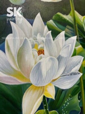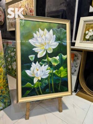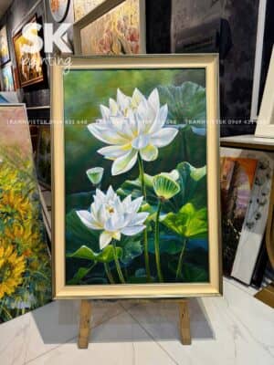 Giữa muôn vàn thể loại tranh sơn dầu đương đại, tranh hoa sen luôn giữ một vị trí đặc biệt trong lòng những người yêu nghệ thuật. Không chỉ vì nét đẹp thanh tao, sen còn là biểu tượng sâu sắc của đạo lý, của tâm hồn an yên và phẩm cách cao quý. Tác phẩm “Bạch Liên An Nhiên” của họa sĩ Sơn Phạm là một minh chứng sống động cho vẻ đẹp và tinh thần đó – một bức tranh sơn dầu vẽ tay đẹp xuất sắc, hội tụ đầy đủ yếu tố nghệ thuật, triết lý và tâm linh.