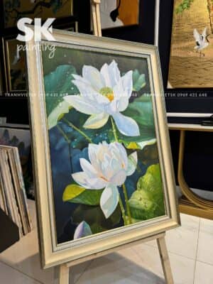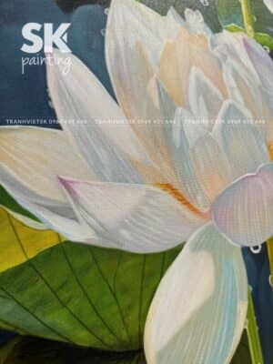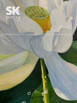 Tranh thể hiện cụm sen trắng nổi bật giữa nền lá xanh, mỗi cánh hoa đều được chăm chút tỉ mỉ đến từng chi tiết. Những hạt nước long lanh, những đường gân trên lá, những búp sen e ấp… tất cả tạo nên một tổng thể đầy sống động nhưng vẫn rất nhẹ nhàng, thanh nhã.