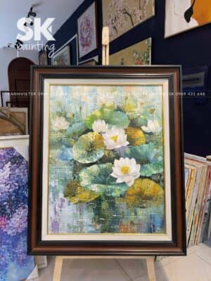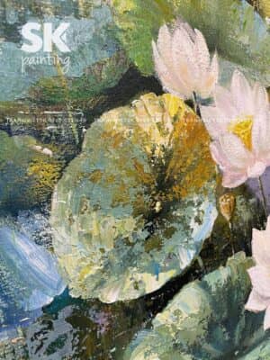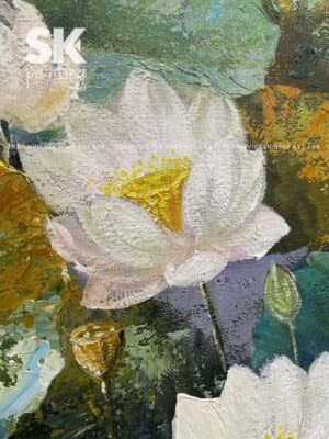 Một trong những điểm mạnh nhất của bức tranh sơn dầu vẽ tay này là khả năng phối màu tinh tế. Sắc trắng của hoa không đơn thuần là trắng tuyệt đối, mà được họa sỹ pha trộn nhiều tông trắng ngà, trắng kem, kết hợp ánh vàng nhẹ, tạo nên cảm giác mềm mại và sống động. Lá sen được thể hiện bằng nhiều lớp màu chồng lên nhau – từ xanh non, xanh lục đậm đến xanh lam – giúp bức tranh có chiều sâu và sự đa dạng thị giác.