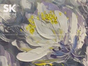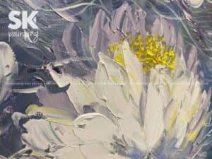 Các lớp màu đan xen, hòa quyện, làm nên chiều sâu của không gian – một đặc trưng nổi bật của tranh sơn dầu vẽ tay. Người xem có thể cảm nhận rõ ràng từng lớp sóng nước, từng cánh hoa, từng tia sáng phản chiếu, tất cả được thể hiện bằng nét cọ uyển chuyển, tinh tế nhưng cũng rất dứt khoát.