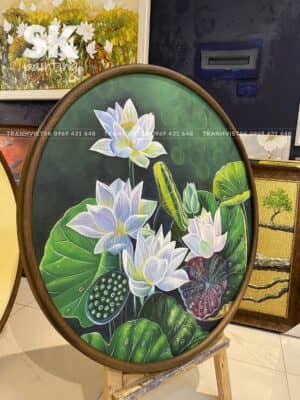 Ngay từ ánh nhìn đầu tiên, bức tranh gây ấn tượng mạnh với bố cục dạng tròn độc đáo, tựa như mặt hồ sen phản chiếu trời mây. Những đóa sen trắng tinh khôi tỏa sáng giữa nền lá xanh thẫm, mang đến cảm giác bình yên và trong trẻo đến lạ.