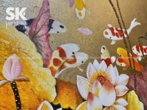 Với biểu tượng cửu ngư – hoa sen – dát vàng, bức tranh cực kỳ phù hợp treo ở phòng khách – nơi đại diện cho năng lượng chủ nhân và sự đón tiếp tài lộc.