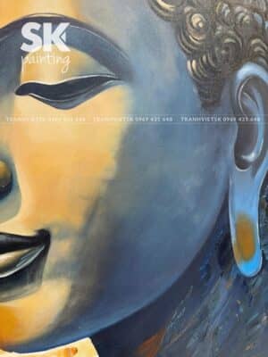 Bức tranh sơn dầu vẽ tay thể hiện cận cảnh nửa khuôn mặt Đức Phật, đôi mắt khép hờ biểu lộ trạng thái thiền định sâu sắc, nụ cười thoáng hiện đầy an nhiên. Nét mặt toát lên sự tĩnh lặng tuyệt đối, tượng trưng cho sự giải thoát khỏi phiền não trần tục. Phía sau là mảng màu vàng dát nhẹ – như ánh hào quang lan tỏa, kết hợp với gam trầm nâu – xanh biểu trưng cho trí tuệ và sự sâu lắng nội tâm.