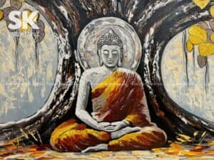 Trung tâm của tác phẩm là hình ảnh Đức Phật ngồi kiết già dưới gốc Bồ Đề – một hình tượng thiêng liêng gắn liền với câu chuyện Ngài đạt đạo. Thân cây Bồ Đề vững chãi, rễ bám sâu, cành lá sum suê được họa sỹ khắc họa bằng những mảng màu vàng, đỏ, cam xen kẽ – như biểu tượng của ánh sáng trí tuệ soi rọi khắp nơi.