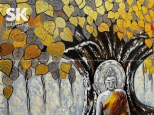 Được sáng tác bằng sơn dầu Pebeo cao cấp của Pháp kết hợp với dát vàng lá Ý 24k, bức tranh không chỉ thể hiện sự chỉn chu trong chất liệu, mà còn là minh chứng cho sự hòa quyện giữa nghệ thuật và tâm linh. Với bố cục hài hòa, gam màu ấm áp cùng hình tượng Đức Phật an tọa dưới gốc cây Bồ Đề, tác phẩm gợi lên cảm giác bình an, thanh tịnh và dẫn dắt người thưởng lãm đến một trạng thái “giác ngộ” nhẹ nhàng.