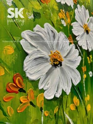 Những bông hoa trắng được vẽ bằng những lớp sơn dày vừa phải, tạo cảm giác nổi khối – khiến người xem gần như có thể chạm vào từng cánh hoa. Trung tâm hoa vàng cam được điểm bằng những nét sơn mạnh mẽ, làm bật lên sự rực rỡ mà vẫn hài hòa.