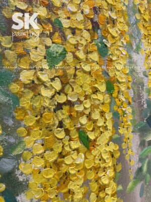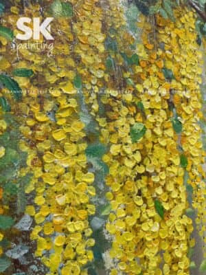 Trong bức tranh sơn dầu “Hoàng Yến Kim An”, hình ảnh những chùm hoa vàng óng đang buông rủ dịu dàng từ tán cây được thể hiện vô cùng sống động, mềm mại và đầy tinh tế. Hoa rủ xuống như những dải lụa óng ánh, lung linh giữa nền xanh mát – tạo nên một khung cảnh vừa êm đềm, vừa giàu sinh khí. Đây không đơn thuần là tranh phong cảnh, mà còn là bức họa truyền tải thông điệp an lành, đủ đầy, phù hợp với tinh thần Á Đông đương đại.