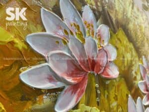 Đặc biệt hơn cả, các chi tiết hoa sen và lá sen còn được dát vàng lá Ý 24k, tăng giá trị thẩm mỹ, nâng tầm đẳng cấp của tác phẩm từ một bức tranh đẹp thành một tác phẩm nghệ thuật cao cấp xứng tầm trưng bày trong các không gian sang trọng bậc nhất.