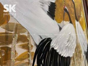 Trung tâm của bức tranh sơn dầu vẽ tay là sáu chú hạc đang sải cánh bay lượn, nhảy múa hoặc nhẹ nhàng dạo bước giữa đầm sen rực rỡ. Những đóa sen bung nở mềm mại trên nền lá sen dát vàng rực rỡ, tạo nên một khung cảnh thơ mộng, bình yên nhưng vẫn tràn đầy sức sống. Bầu trời sáng dịu, phản chiếu mặt nước tĩnh lặng, gợi nên sự an hòa giữa đất trời và muôn loài.