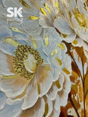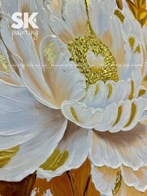 Các tác phẩm có tông màu nhẹ nhàng, trắng – kem – vàng pastel như mẫu đơn trắng, mẫu đơn đôi rất phù hợp để treo trong phòng ngủ. Không chỉ làm đẹp không gian, mà còn tạo cảm giác an nhiên, thư giãn và lan tỏa năng lượng tích cực, gắn kết các thành viên trong gia đình.