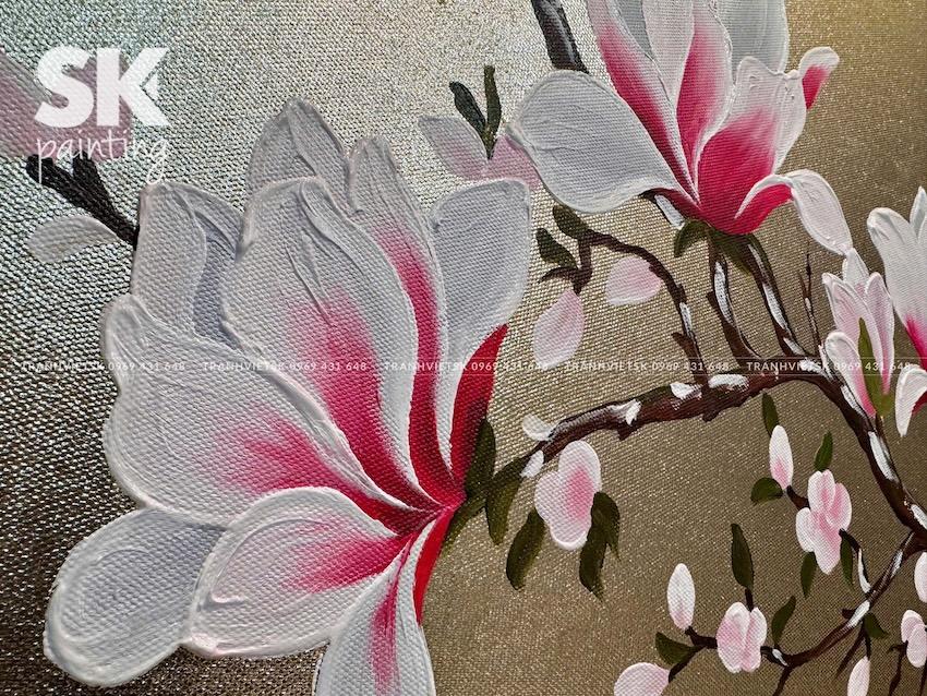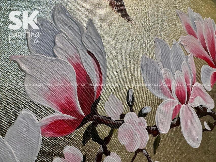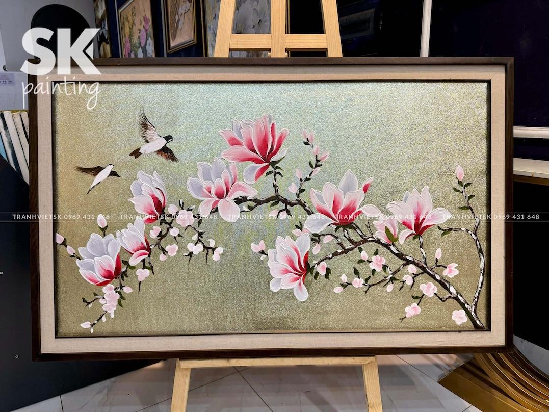 Với hình ảnh hoa mộc lan nở rộ nhẹ nhàng, kết hợp ánh vàng sang trọng, bức tranh mang đến một nguồn năng lượng tích cực cho không gian làm việc, giúp cân bằng tâm lý và khơi nguồn cảm hứng sáng tạo. Đây cũng là lựa chọn lý tưởng cho không gian đọc sách, thiền định hoặc phòng giám đốc trong môi trường doanh nghiệp.