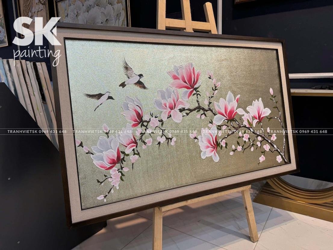 Không cần quá rực rỡ, tranh có thể treo ở đầu giường hoặc bên hông giường ngủ để tạo cảm giác thư giãn. Hình ảnh mộc lan tượng trưng cho sự nữ tính, dịu dàng – rất phù hợp cho phòng ngủ cặp đôi hoặc phòng cá nhân yêu thích sự bình yên, lãng mạn.