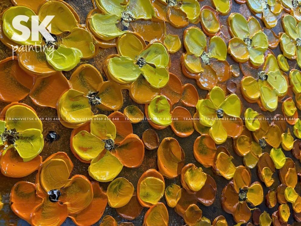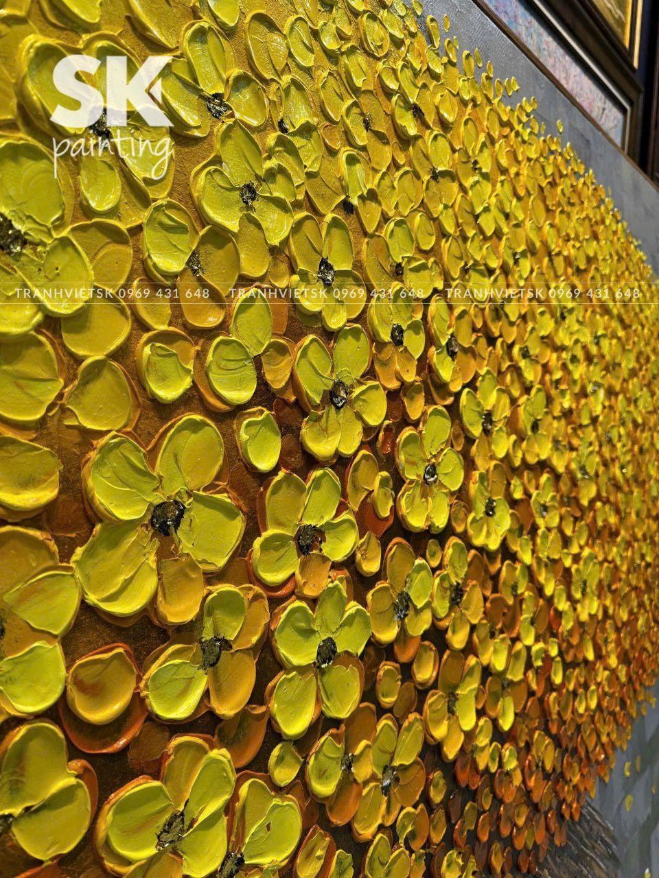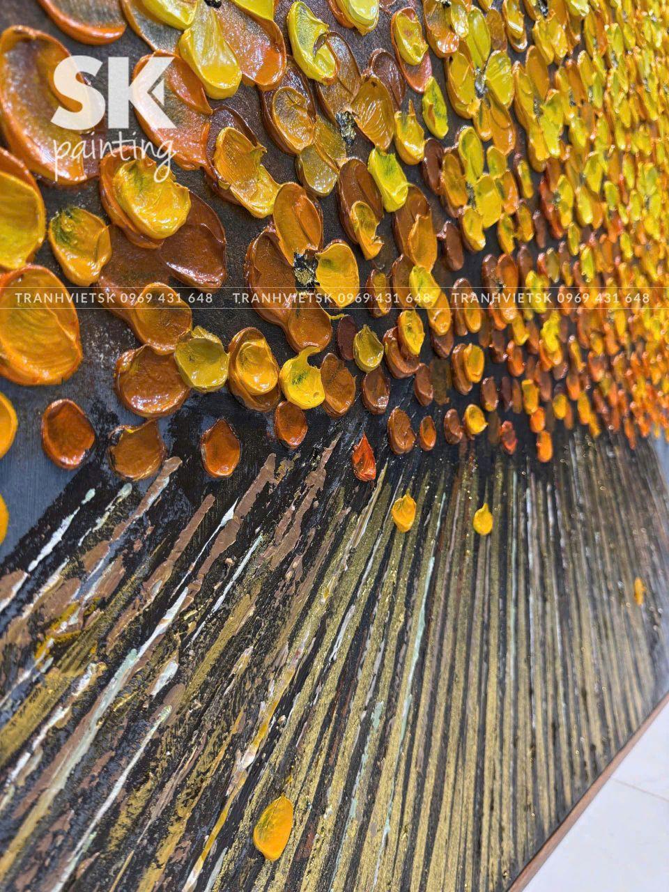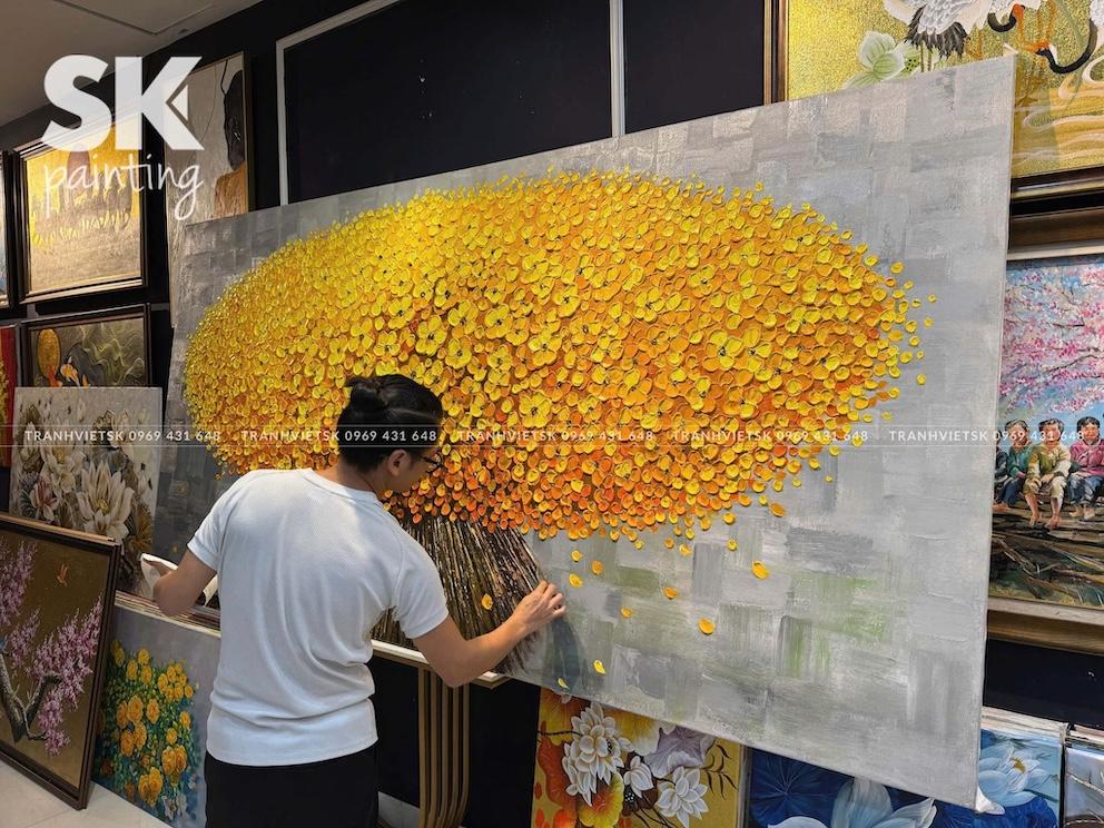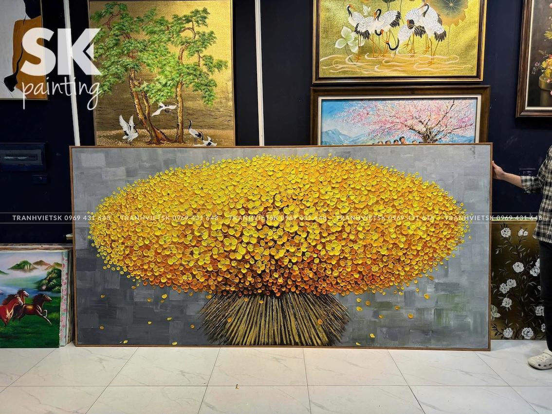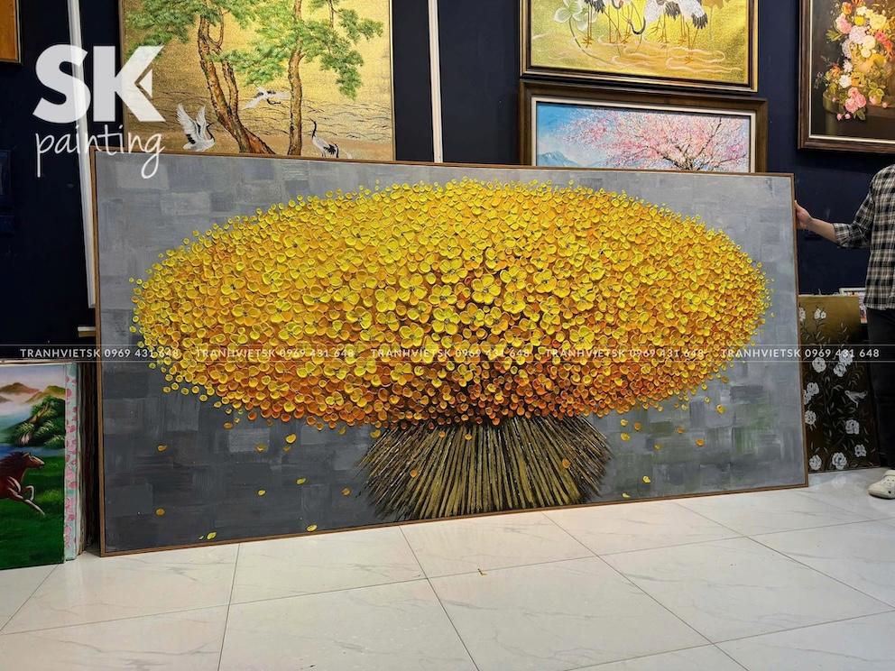 Ngay từ cái nhìn đầu tiên, bức tranh sơn dầu vẽ tay này thu hút ánh nhìn bởi mảng hoa vàng kim trải rộng, bung nở như một vòm tán lớn, gợi liên tưởng đến cây tài lộc hay kho báu dồi dào. Sắc vàng – màu sắc của phú quý và thịnh vượng – được xử lý khéo léo trên nền xám trung tính, tạo nên sự tương phản mạnh mẽ nhưng hài hòa, sang trọng.