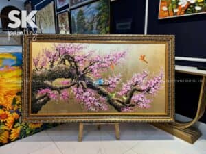 Vẻ đẹp tinh tế và sắc vàng quyền quý trong tranh giúp tạo nên không gian làm việc đầy cảm hứng, nâng cao tinh thần tích cực và sáng tạo. Hình ảnh hoa đào nở rộ như lời nhắc nhở về sự sinh sôi, phát triển và bền vững trong công việc và sự nghiệp.