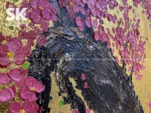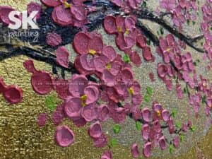Dát vàng lá 24k của Ý: Bề mặt tranh được nghệ nhân dát thủ công bằng vàng lá cao cấp, tạo nên hiệu ứng ánh kim sang trọng và đắt giá. Ánh vàng lấp lánh không chỉ làm nền cho sắc đào thêm rực rỡ mà còn giúp bức tranh trở nên quý phái, xứng đáng là điểm nhấn nghệ thuật trong những không gian đẳng cấp.