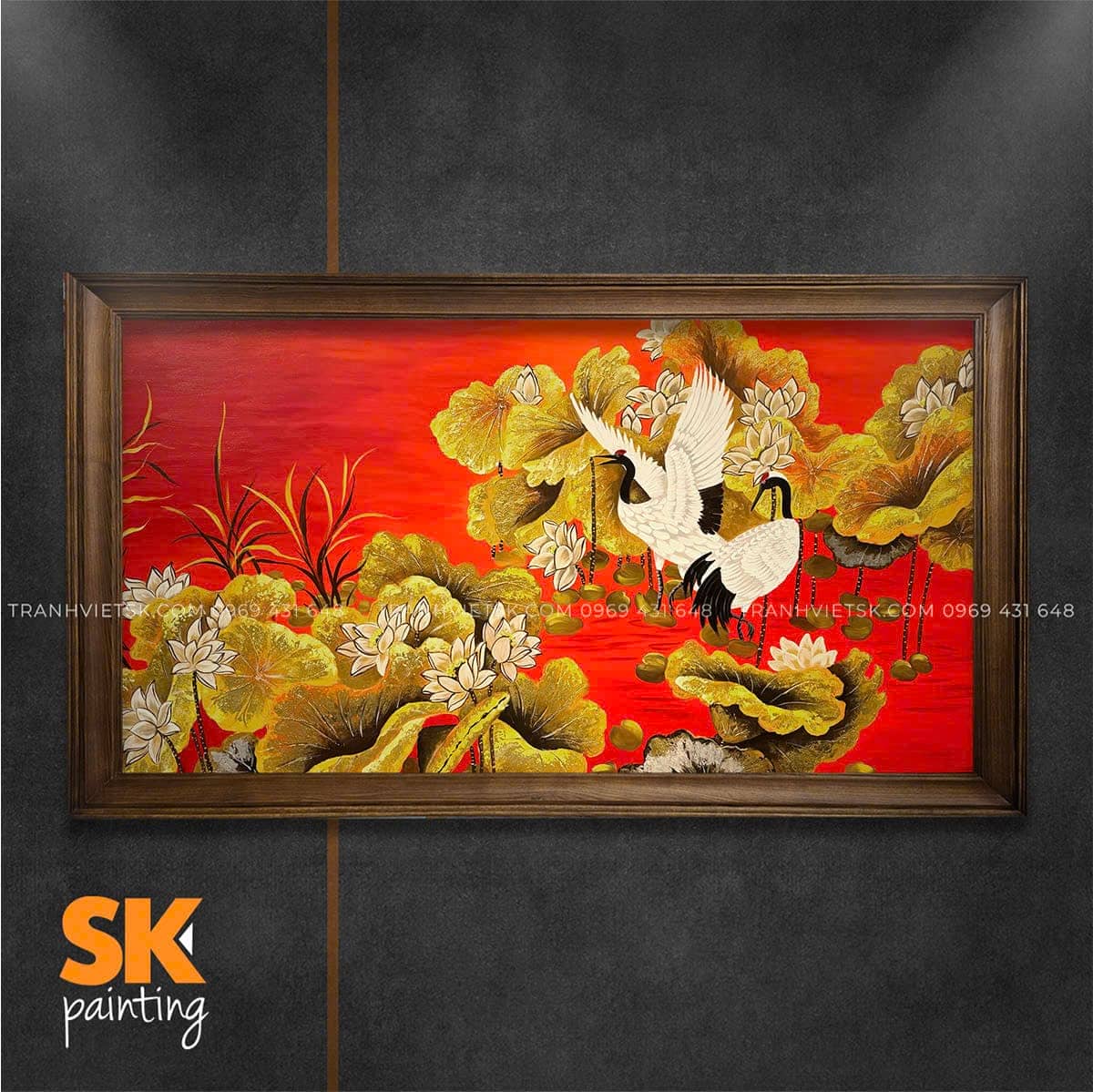 Nét vẽ tay thủ công: Từng chi tiết lông hạc, gân lá, cánh sen… đều được họa sĩ Sơn Phạm thể hiện bằng cọ tay với độ dày sơn vừa đủ tạo nên hiệu ứng nổi 3D đặc biệt. Đây chính là điểm khiến tác phẩm trở thành tranh sơn dầu vẽ tay cao cấp, khác biệt hoàn toàn với tranh in hoặc tranh công nghiệp.