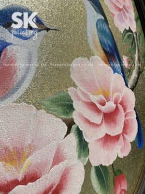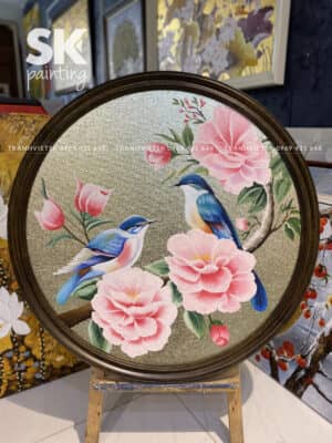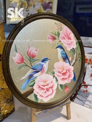 Hai chú chim được vẽ với sắc xanh lam, trắng và điểm sắc vàng – tạo sự tương phản nổi bật với nền hoa mẫu đơn rực rỡ sắc hồng. Bố cục tròn của tranh mang tính biểu tượng cao: vòng tròn viên mãn – tượng trưng cho sự đầy đủ, tròn vẹn, kết nối vĩnh hằng không ranh giới giữa tình cảm và không gian.