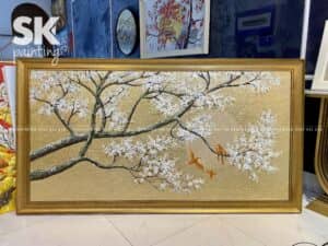 Họa sĩ đã sử dụng gam màu vàng đồng làm nền chủ đạo, kết hợp với sắc trắng thanh khiết của hoa và cam vàng đồng của chim, tạo nên bản hòa ca thị giác hài hòa nhưng vẫn đầy sức sống. Các nét vẽ mềm mại, tinh xảo, đặc biệt ở phần cánh hoa và nhánh cây, cho thấy sự khéo léo và kinh nghiệm lâu năm của người nghệ nhân.