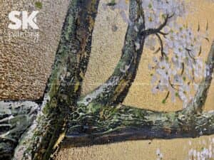 Điểm đặc biệt khiến bức tranh sơn dầu vẽ tay này trở nên cao cấp là việc sử dụng sơn dầu Pebeo của Pháp – một trong những dòng sơn dầu danh tiếng bởi độ bền màu, độ mịn và khả năng tạo chiều sâu vượt trội. Ngoài ra, tác phẩm được dát vàng lá 24k nhập khẩu từ Ý, tạo nên hiệu ứng lấp lánh sang trọng, phản chiếu ánh sáng tự nhiên giúp bức tranh thay đổi sắc độ theo từng góc nhìn.