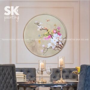 Tranh hoa xuân với bố cục tròn mang lại cảm giác viên mãn, hạnh phúc, rất thích hợp cho khu vực bàn ăn – nơi các thành viên trong gia đình gắn kết sau một ngày dài. Ánh sáng phản chiếu từ nền vàng sẽ tạo không khí ấm cúng, gần gũi và đầy tính nghệ thuật.