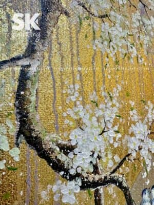 Trong số những tranh sơn dầu mang đậm hơi thở thiên nhiên và chiều sâu tinh thần, “Xuân Về Kim An” là một tác phẩm độc đáo, dung dị mà cuốn hút. Cảnh vật hiện lên không quá phức tạp, chỉ với vài nhánh hoa trắng đang nở rộ trên nền ánh vàng dát lấp lánh – nhưng lại đủ sức tạo nên một thế giới riêng, tách biệt với ồn ào bên ngoài.