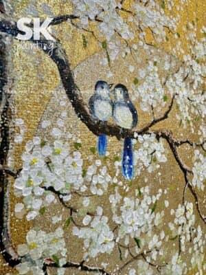 Vẻ đẹp trong tranh không đến từ sự phô trương, mà từ sự giản dị đầy dụng ý. Những cánh hoa mỏng manh đua nhau bung nở, chim xanh song đôi đậu trên cành, ánh vàng của buổi sớm mai phủ kín nền tranh như lời chúc phúc nhẹ nhàng. Đó là vẻ đẹp an yên – một thứ an yên mang lại cảm giác trọn vẹn cho cả người ngắm và không gian được trưng bày.