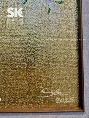 Đặc biệt, nền tranh được dát vàng lá Ý 24k – không chỉ để trang trí mà còn nâng tầm chiều sâu, độ phản sáng và sự sang trọng cho toàn bộ bố cục. Dưới ánh đèn hoặc ánh sáng tự nhiên, bức tranh như phát sáng, tạo cảm giác huyền ảo và thiêng liêng, như một “vầng thái dương” soi sáng tâm hồn người ngắm.