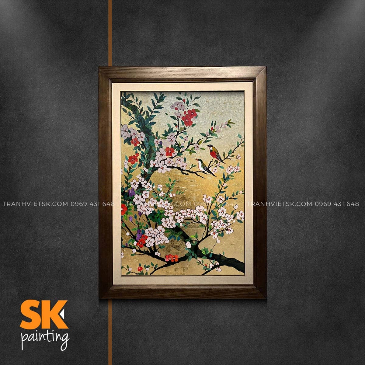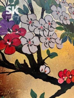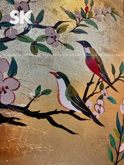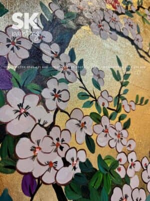 Sự kết hợp giữa nền vàng ánh kim và các gam màu tự nhiên như trắng, hồng, đỏ, xanh lá… đã tạo nên tổng thể đầy sức sống nhưng vẫn giữ được sự dịu mắt. Các sắc độ được chuyển mượt mà, giúp hình ảnh trong tranh không bị “cứng”, mà mềm mại, có chiều sâu và rất thực tế.
