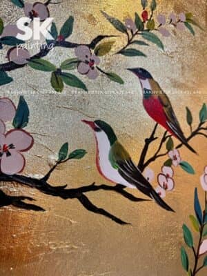 Các mảng hoa lớn và nhỏ được phối hợp nhịp nhàng tạo nên chiều sâu cho bố cục. Chim chóc trong tranh được vẽ theo hướng “quy tụ” – mang ý nghĩa sum vầy, đoàn viên, kết nối và gắn bó. Bức tranh không có quá nhiều chi tiết thừa, tất cả đều hài hòa, mang tính biểu tượng cao cho sự no đủ, an khang và phúc lộc.
